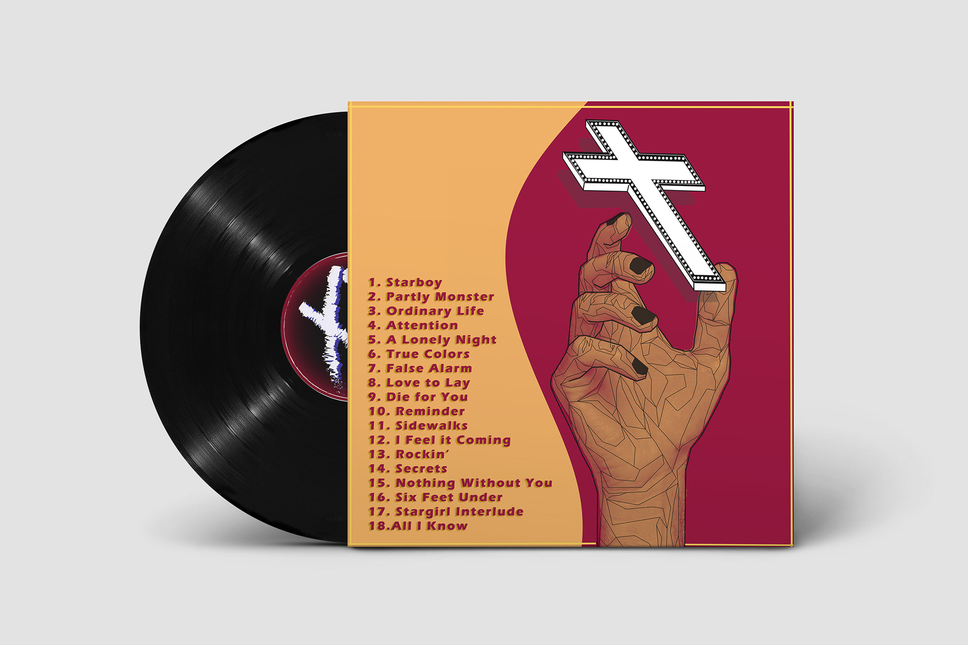 Using a combination of illustration, graphics, typography, and photography, I created a redesign of the Starboy album cover. By alluding to certain scenes within the music video, I was able to draw a color palette and theme to express within my design. I played with texture and value on the front cover and focused more on the geometrical line on the back cover.