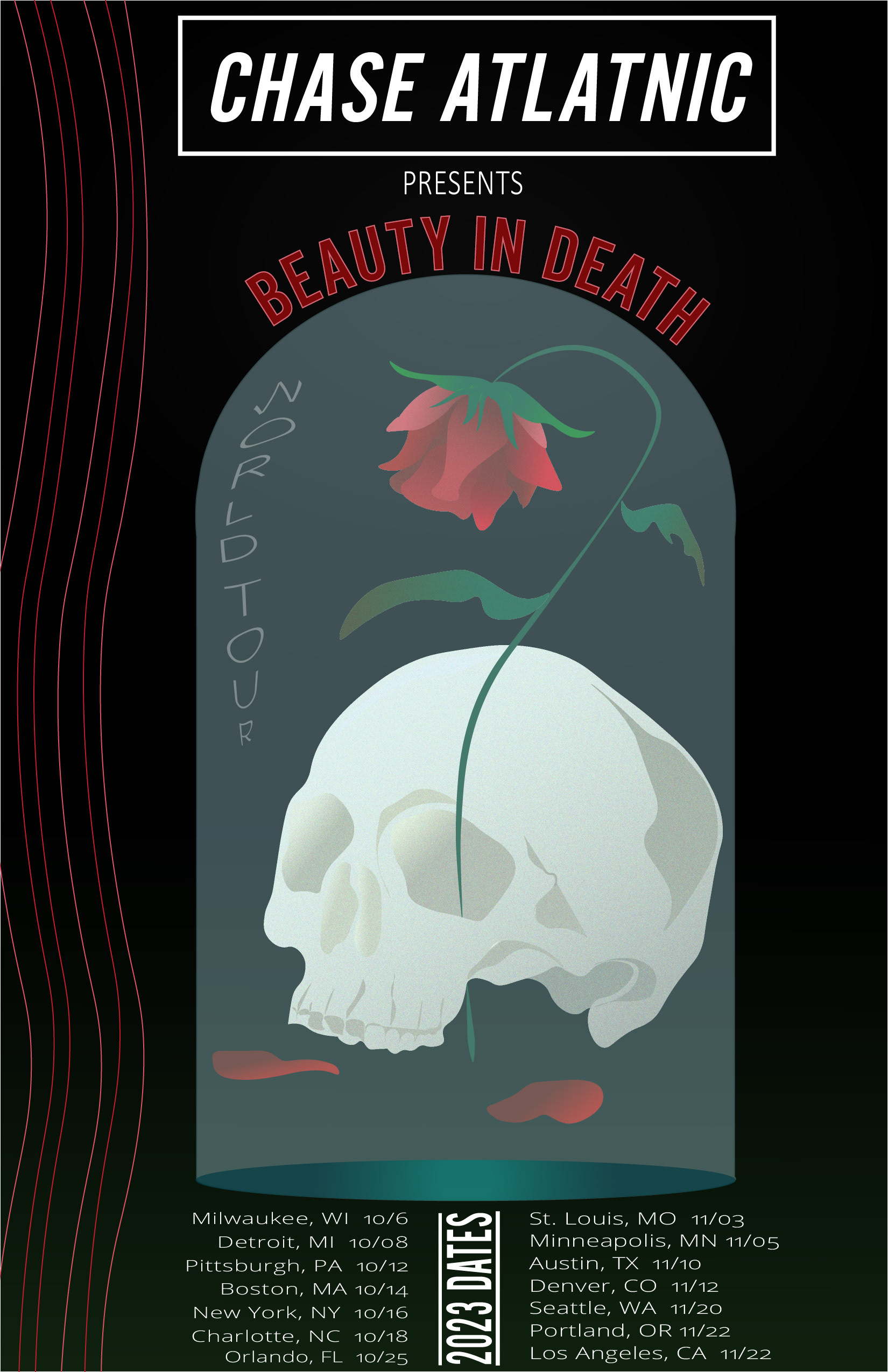 This is an experimental poster design for the band Chase Atlantic. I took inspiration from their music and past album covers to create a graphical poster that speaks the theme of their songs. I used dark tones to create a looming feeling when looking at the photo and red to reflect the romance they highlight in their songs.